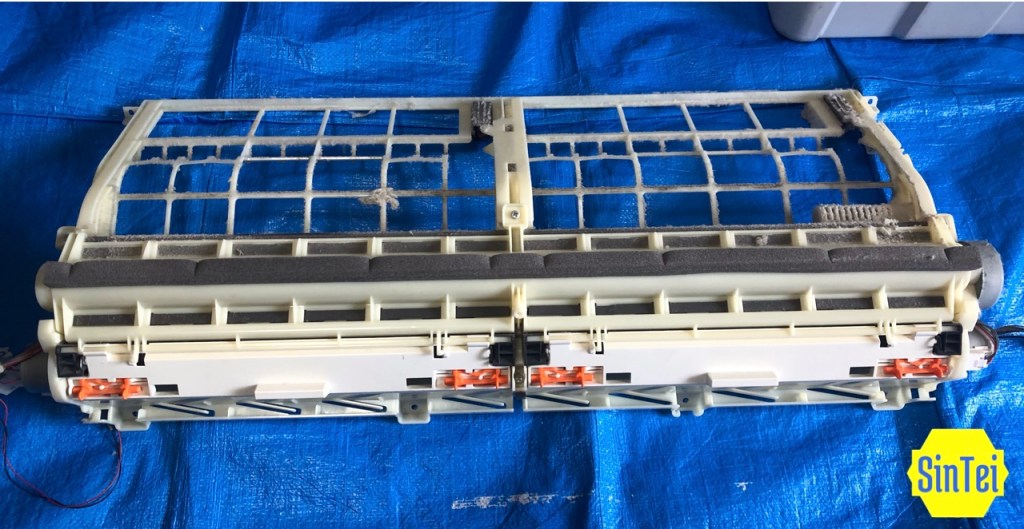 訪問して話を聞くと、エアコンの左下から水がポタポタ落ちるらしい。確かに床に水染みが出来ていました。動作確認を行い、部品を取り外してくと汚れが見えてきました。