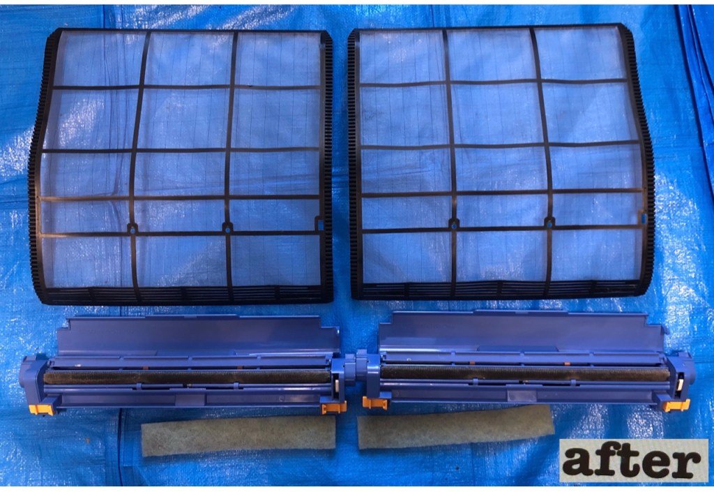 お掃除ユニットは基盤や配線があるので水洗いはせず、手拭きで汚れを取りました。他の部品やエアコン本体は高圧洗浄機で水洗いしましたが、エアコン本体から出た汚水は真っ黒でした。