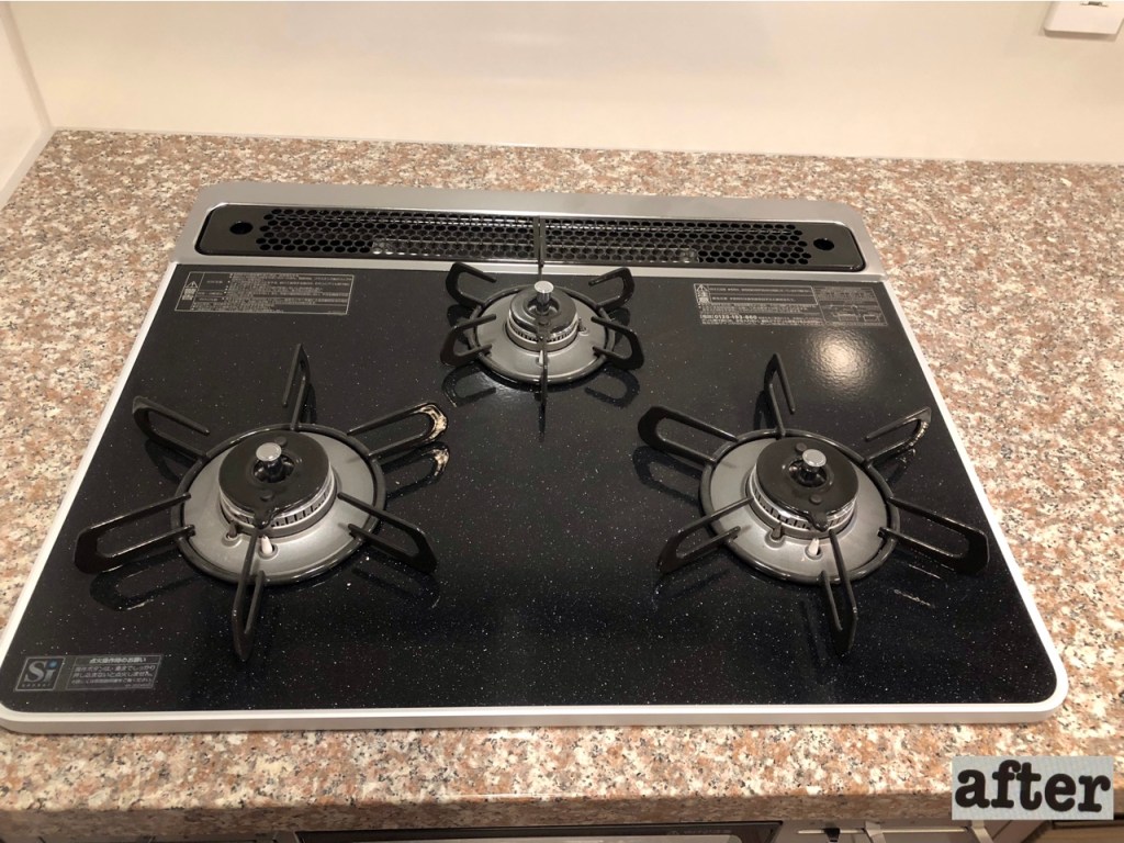 キッチンは、コンロ、シンク、カウンター、壁面、収納扉が標準施工範囲です。魚焼きグリル、食洗機はオプションで対応しています。レンジフードはファンも取り外し、カバーやフィルターや整流板も含め作業していきます。特にコンロやレンジフードファン等はお手入れが大変な場所になるので、一度汚れをリセットする事をオススメします。今回、空室状態であったので、収納内部をサービス対応しました。